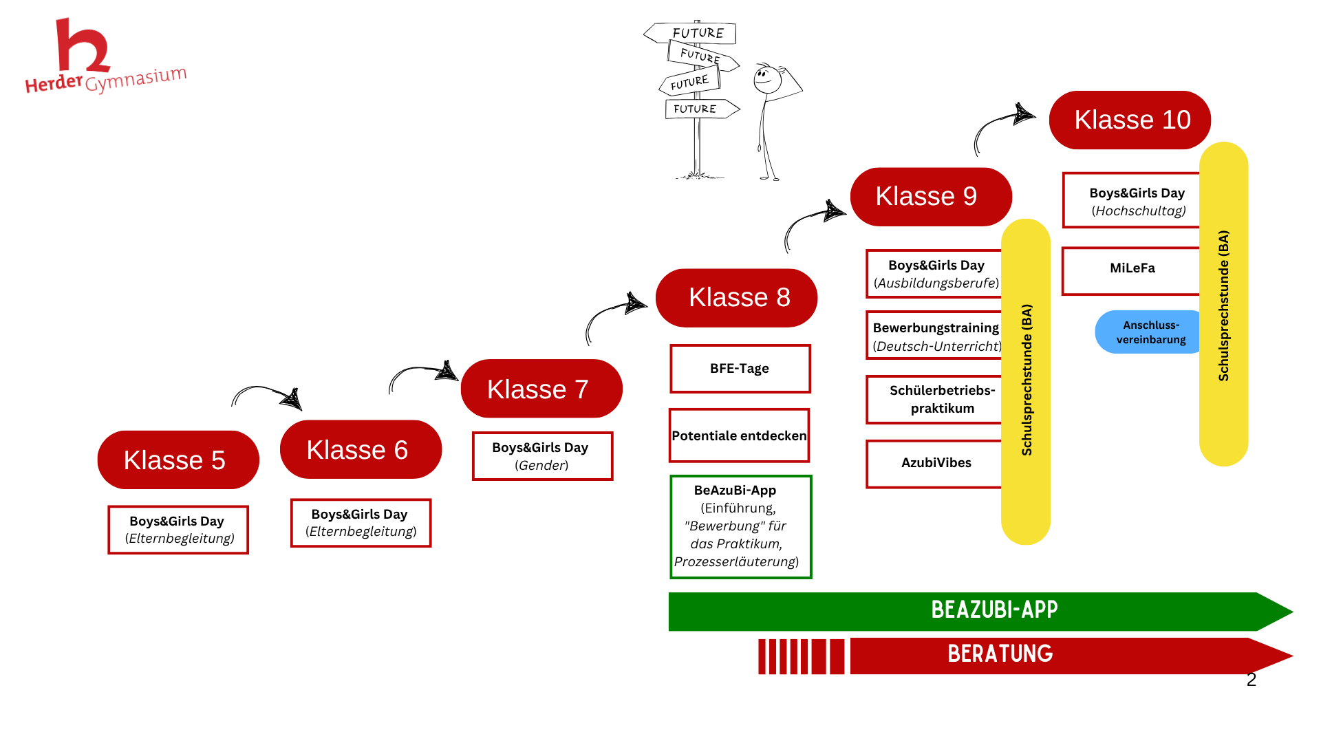 Industrie, Handel, Verbänden, Stadt Minden, Hochschulen und Kliniken in die berufliche Orientierung einbeziehen. Dies soll Schülerinnen und Schülern möglichst viele und unterschiedliche berufliche Begegnungenermöglichen, so dass sie eine differenzierten Berufsentscheidung treffen können. Die Zusammenarbeit mit dem eHer-Verein (der ehemaligen Herderaner), der Bundesagentur für Arbeit sowie dem Programm Talentscout, bringen dabei wichtige Sichtweisen ein und ergänzen das Angebot maßgeblich.