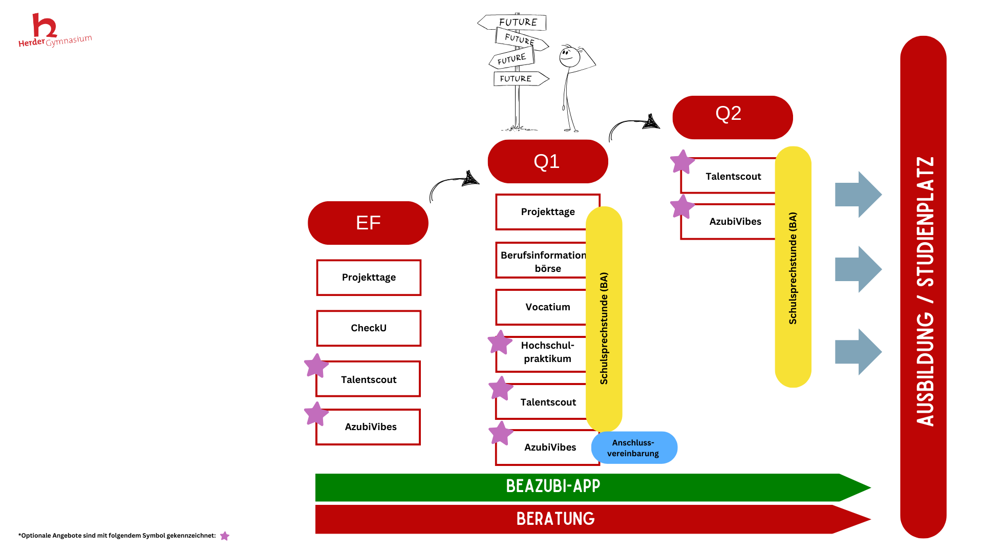 Besonders wichtig ist für uns eine kontinuierliche Beratung unserer Schülerinnen und Schüler. Von Klasse 9 bis zur Q2 erfolgt das turnusmäßig für alle einmal im Schuljahr in der Schule. Unterstützt werden wir dabei durch die Bundesagentur für Arbeit in Person von Herrn Ngo, der nicht nur in Form einer alle vierzehn Tage stattfindenden Schulsprechstunden (Anmeldung über das Modul „Texte“ in IServ) Schülerinnen und Schüler individuell berät, sondern auch durch andere Unterstützungsformate.